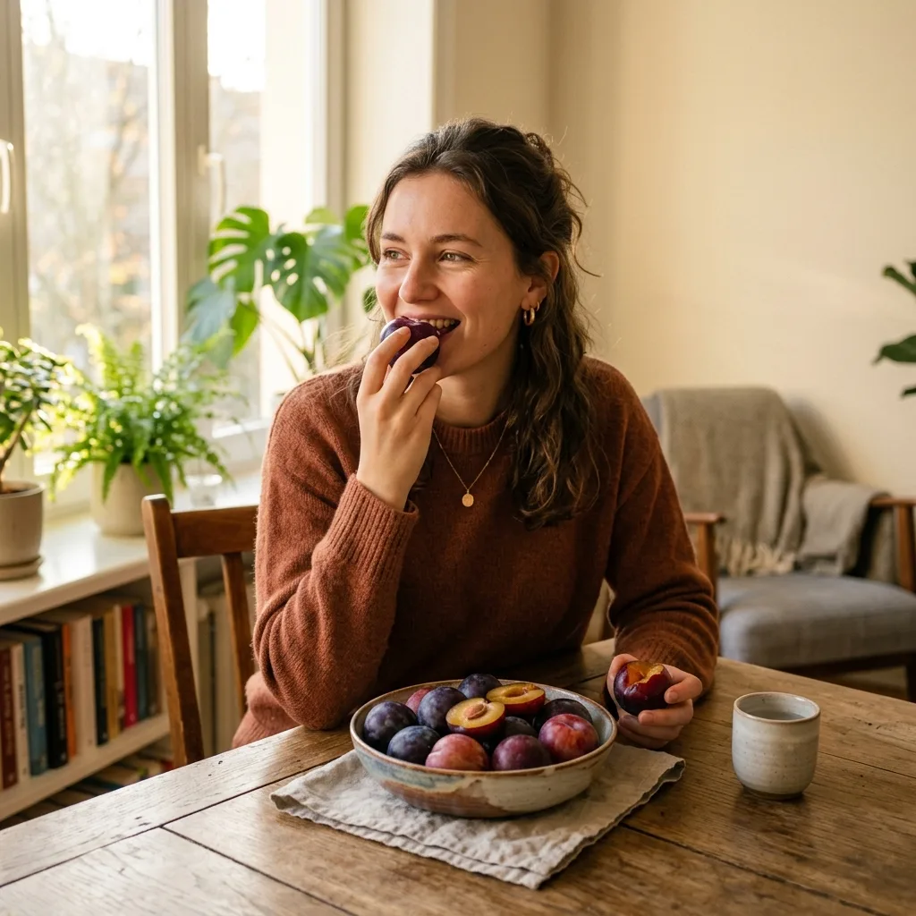 Over several weeks, the plum eater starts noticing something: less bloating after dinner, more regular mornings, and less of that afternoon energy slump that often comes with sluggish digestion.